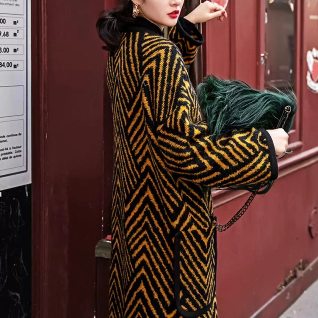 裾や袖口に施されたパイピングデザインが今年らしいジャガード柄のノーカラーコート。