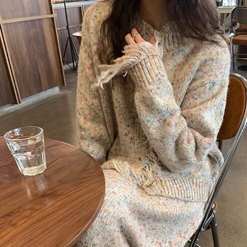 フリンジ使いがアクセントになるトレンドのニットカーデ×ニットスカートのセットアップ。