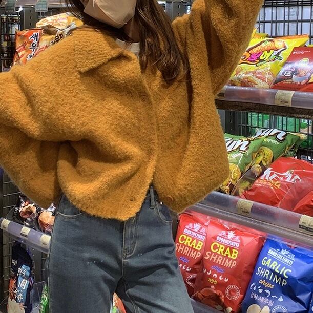襟付きデザインが特徴的なニットカーディガン。肩のラインを落としたゆったりめのシルエットがこなれ感を演出します♪