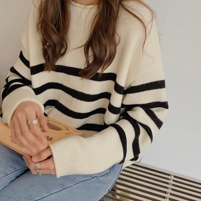 カジュアルなボーダー柄のロールネックニット。くるんとロールのネックと袖口、裾がさり気ない抜け感を演出♪