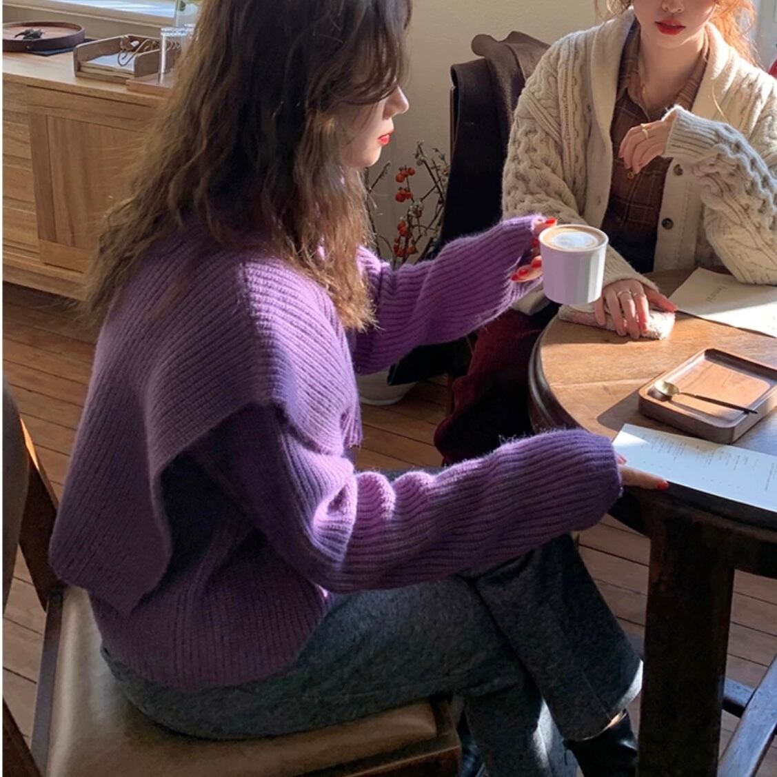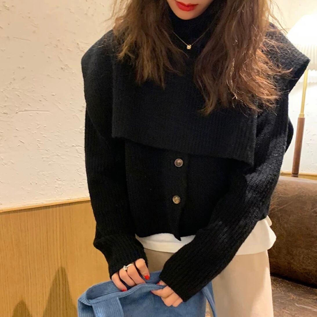タートルネック仕様のショートニットとシンプルなクルーネックカーディガンのセットアイテム。
