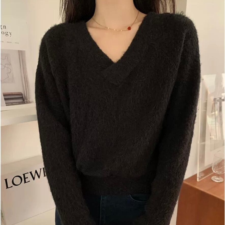 程よい厚みのニットにVネックですっきりとした印象をプラス♪