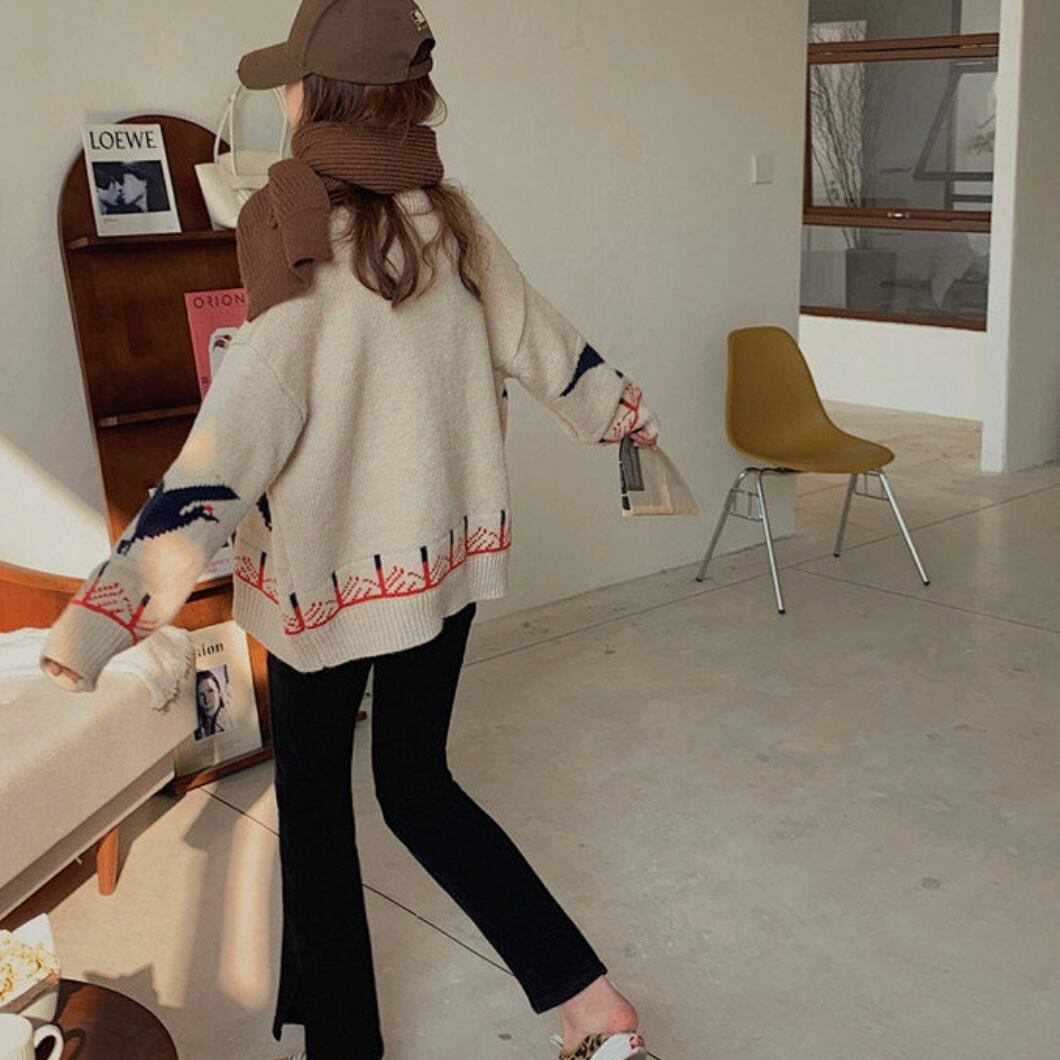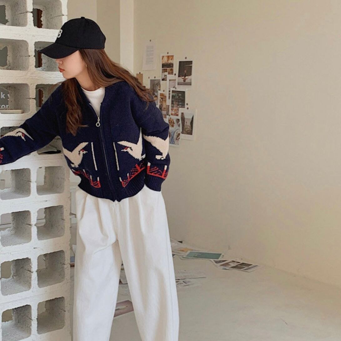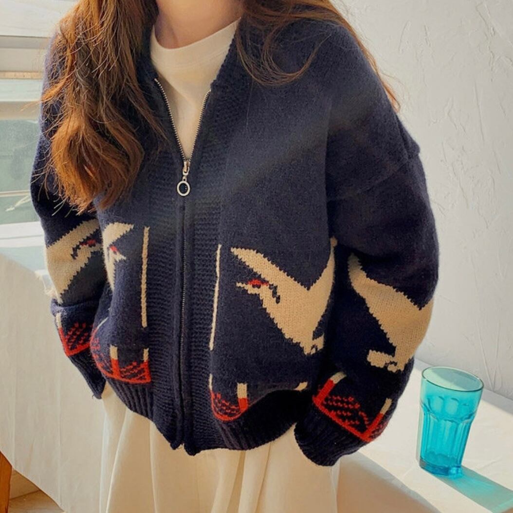 全体に羽ばたく鳥モチーフをあしらわれたジャガード柄が目をひくカーディガン。