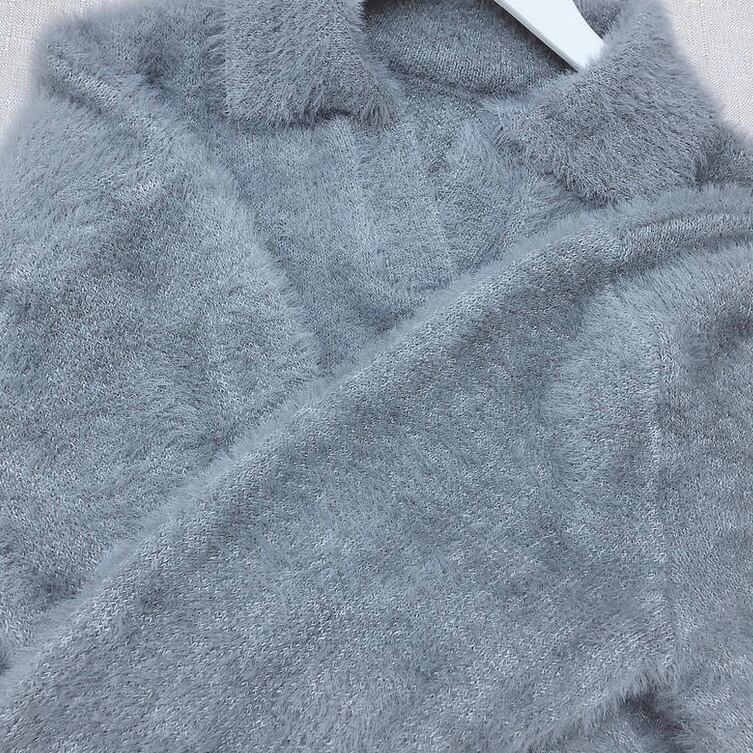 ハンサムなポロ衿も深めのVネックでデコルテを綺麗に見せて女性らしい印象に◎
