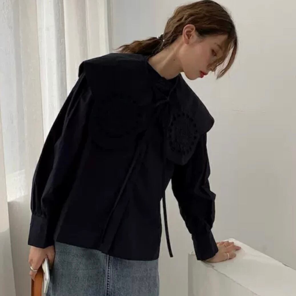 取り外し可能な存在感のある大きな襟が特徴的なブラウス。