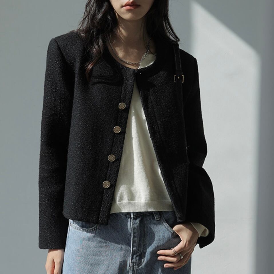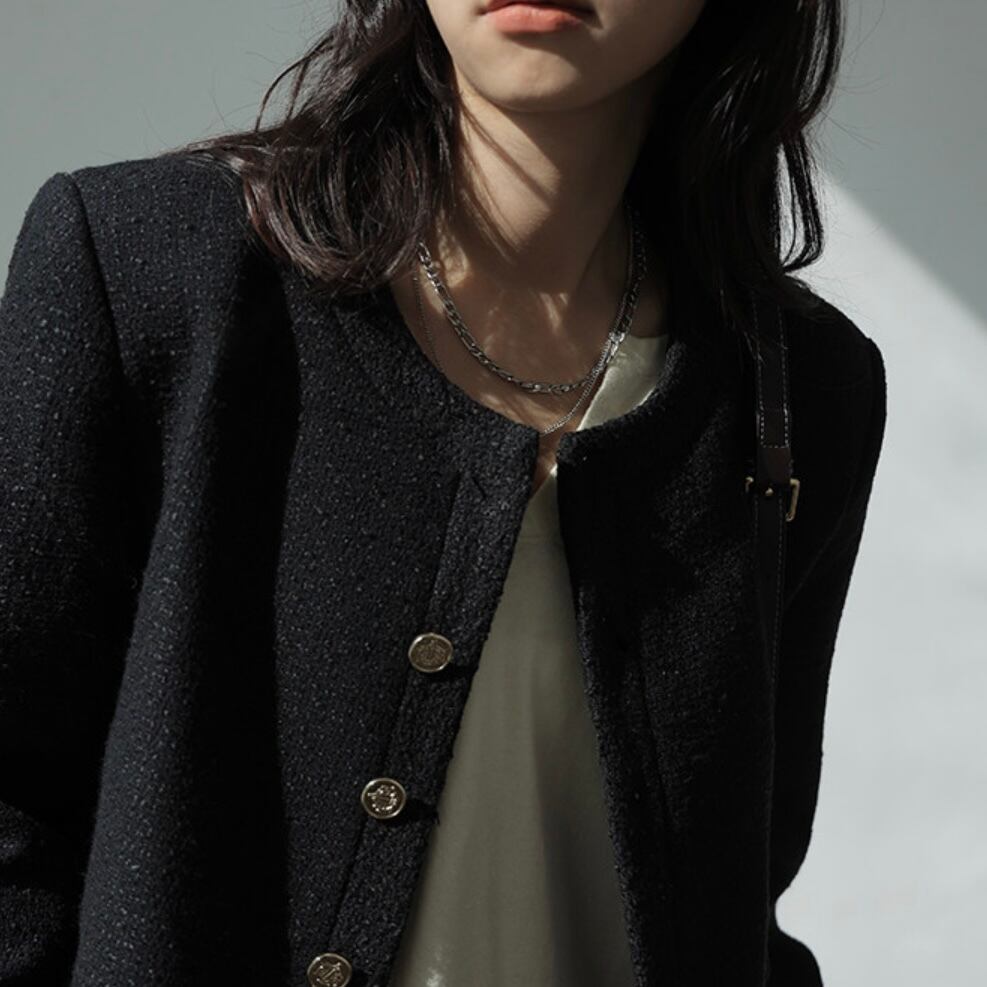 ゴールドボタンが上品レディな印象のツイードジャケット。