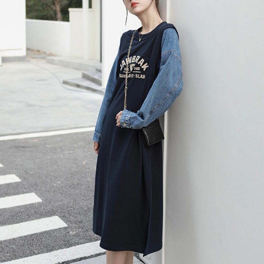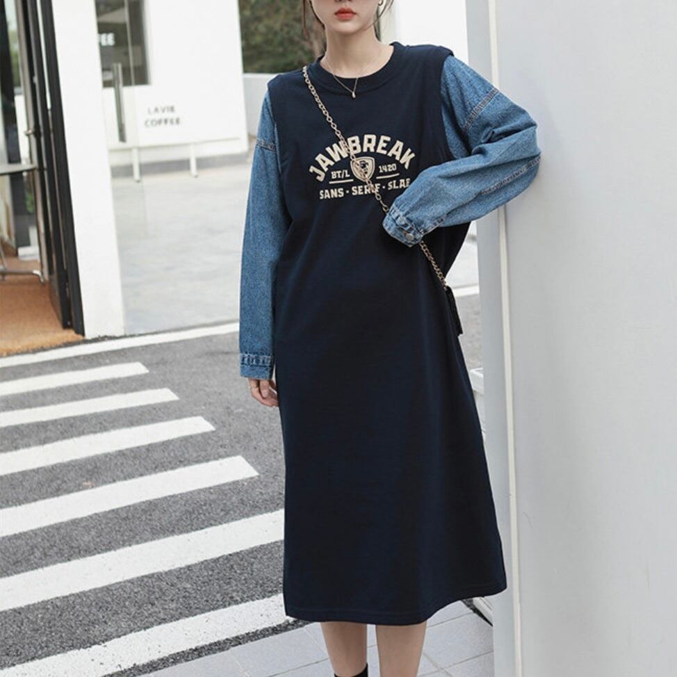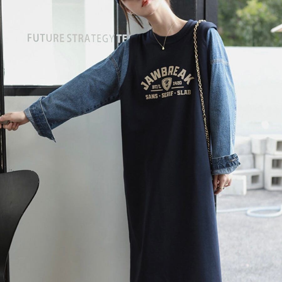 フロントのアーチロゴとデニムスリーブが目を惹くレイヤード風ワンピース。