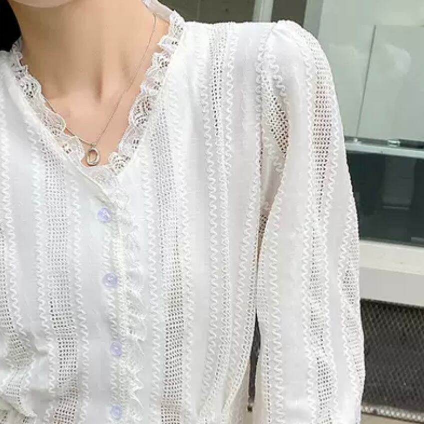首元はスッキリと見えるVネックにスカラップレースで上品な肌見せが叶うアイテム♪