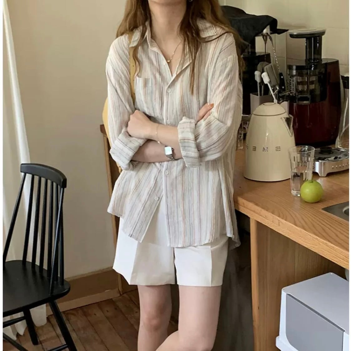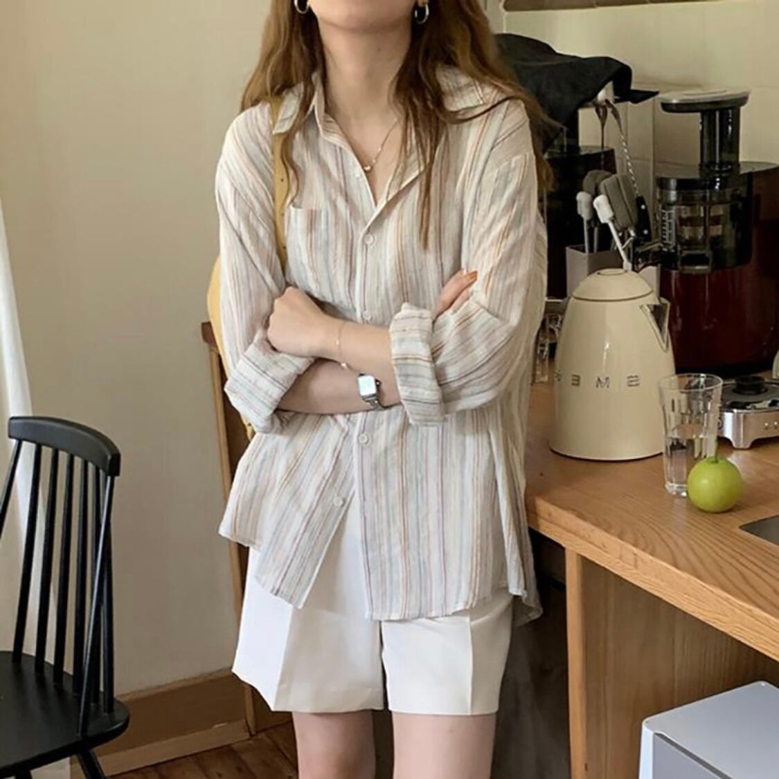縦ラインでスラっとした印象を与えてくれるストライプシャツ。