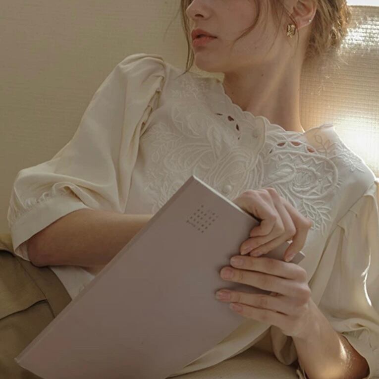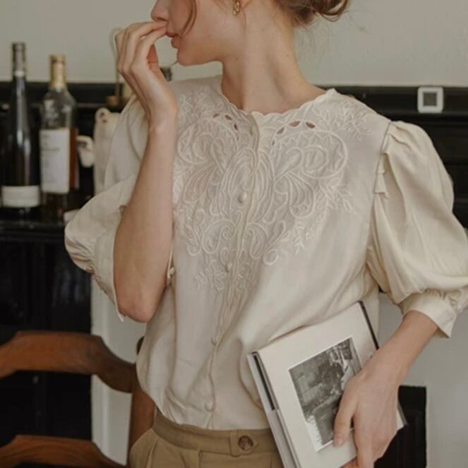 今年注目のボリュームスリーブがポイントの大人可愛い刺繍ブラウスです。
