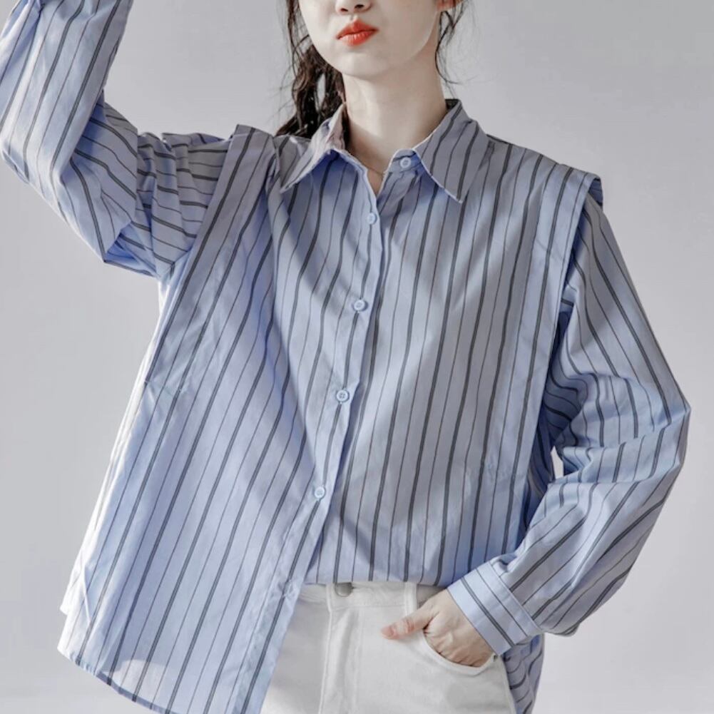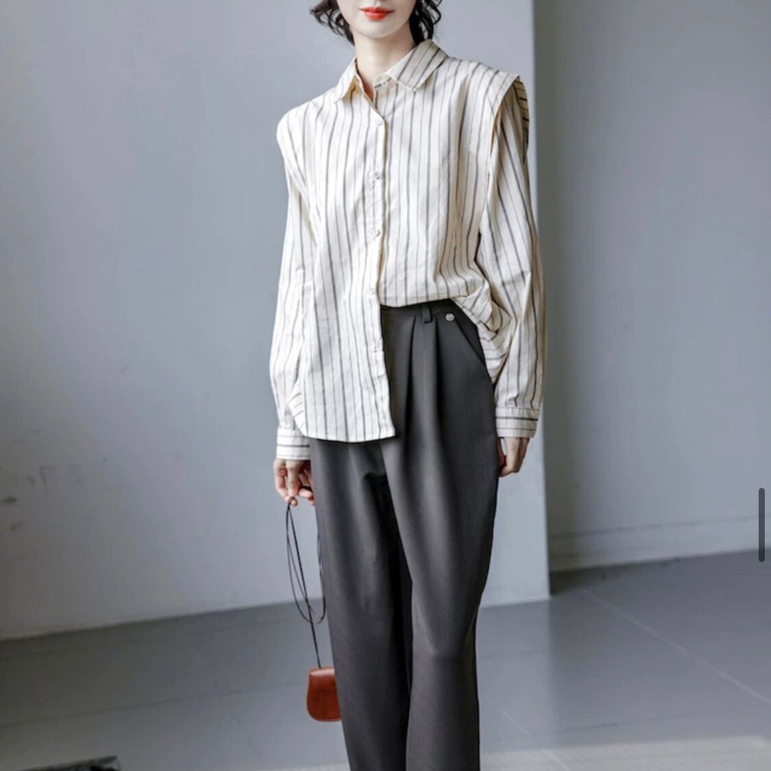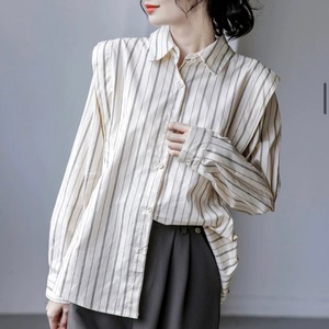 今季も引き続きトレンドのショルダー部分のタックが目を引く、ストライプシャツ。