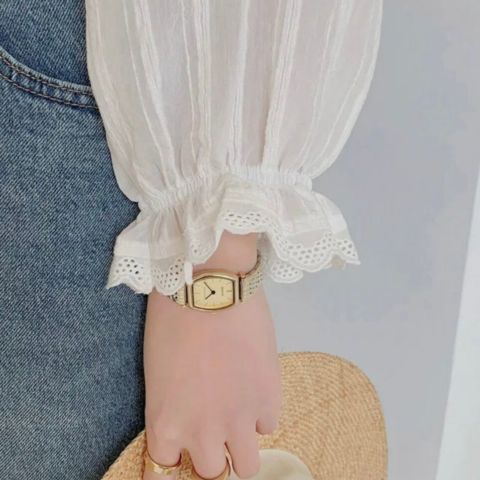 シアーストライプ生地を使用したガーリーなデザイントップス。