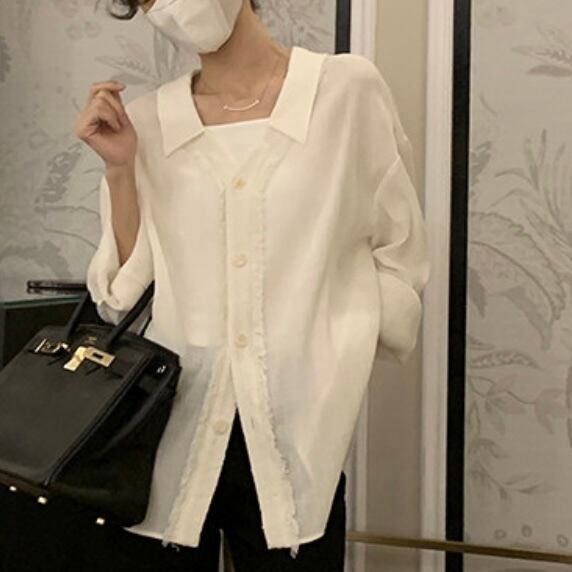 前立てのフリンジデザインがエレガントな印象に見せてくれる襟付きデザインブラウス。