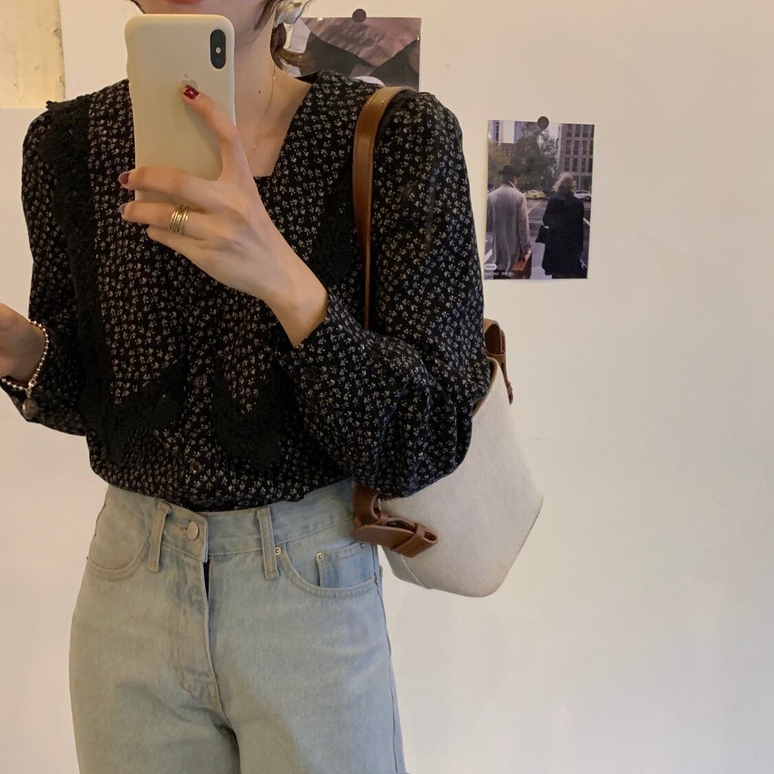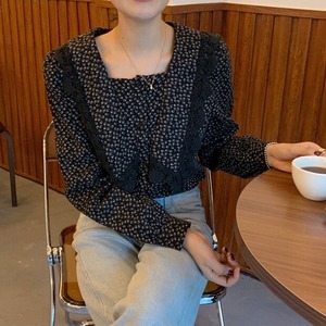 小花をたっぷりとちりばめ、トレンドのビッグカラーにレースで甘さを足した華やかなルックスのブラウス。