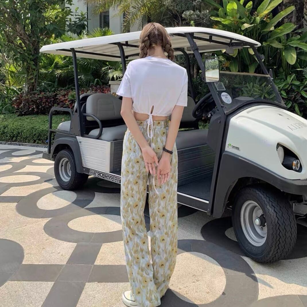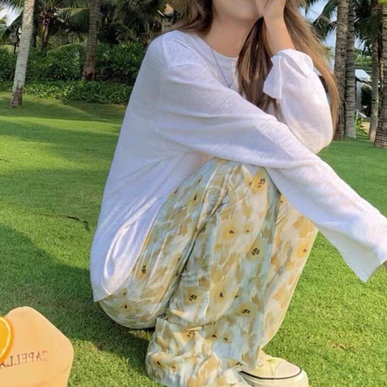 春らしいパステル調の水彩画のようなぼやけた花柄をプリントしたパンツ。