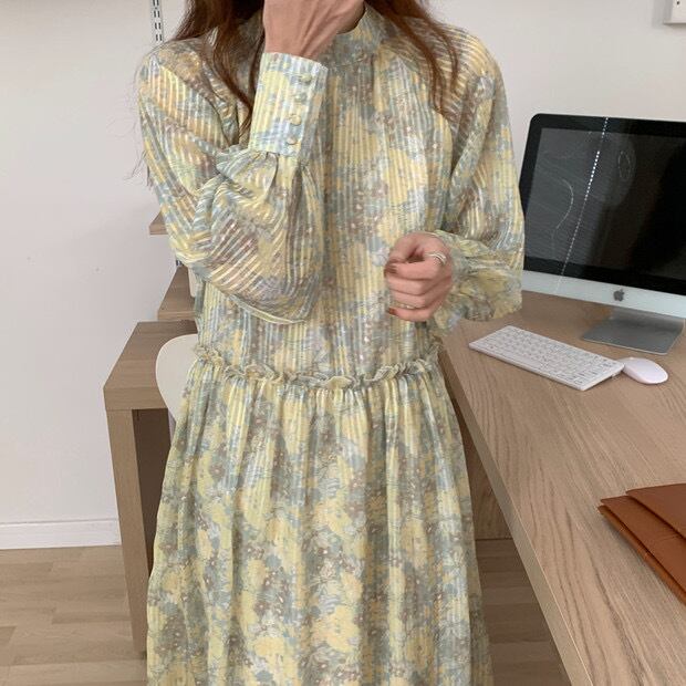 透け感のあるボイルストライプ地に、動きのある花柄をプリントしたテキスタイルで女性らしさを演出♪