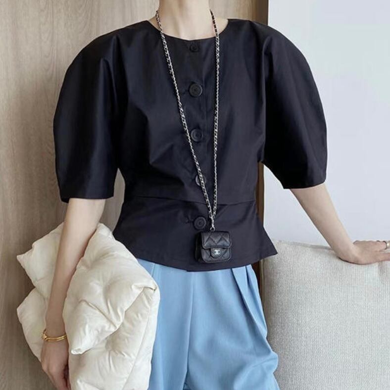 センターにあしらった大きめの飾り釦が高感度なアクセント◎