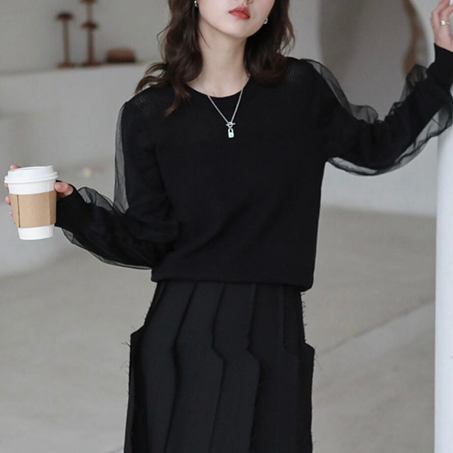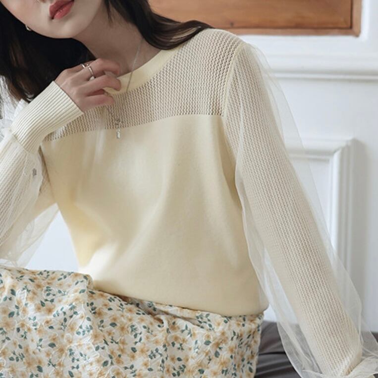 ふんわりとしたスリーブのシルエットと、シアー感のあるチュールがフェミニンな印象のプルオーバーニットです♪