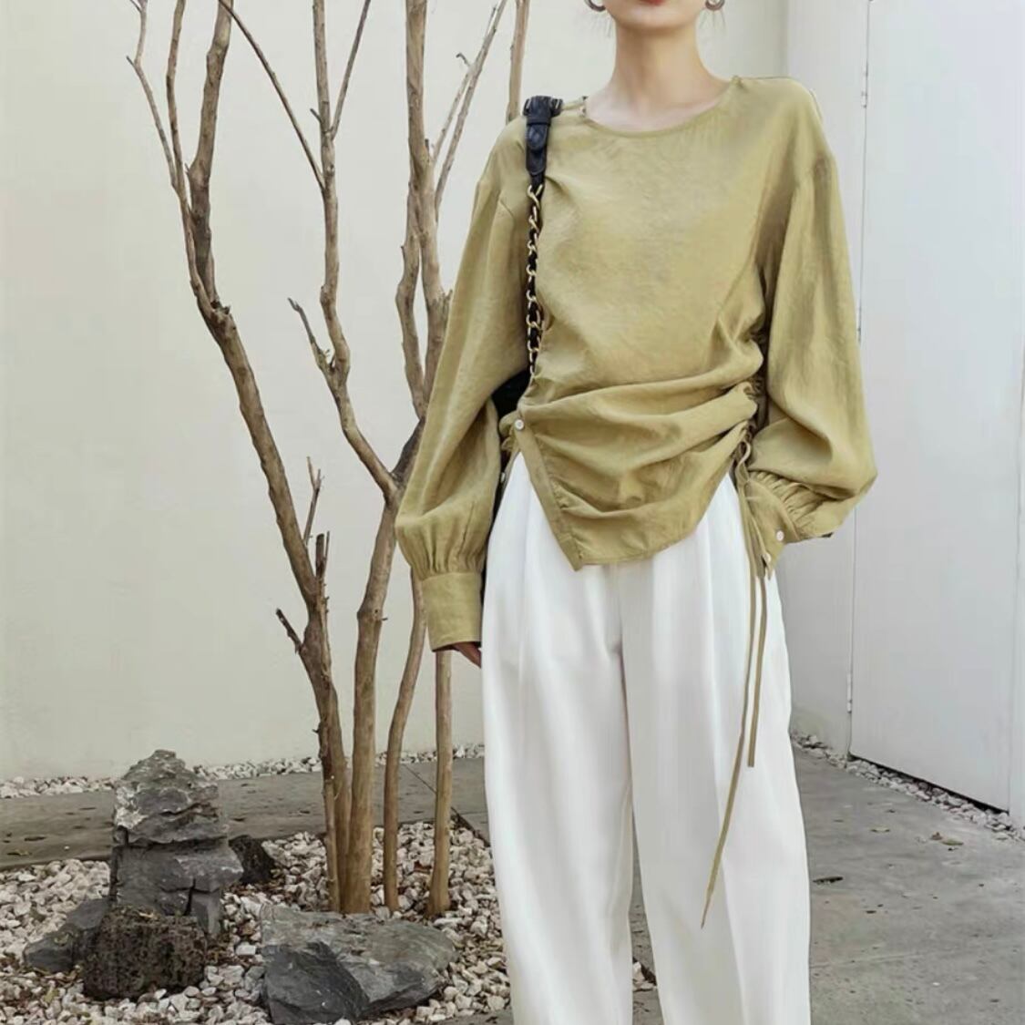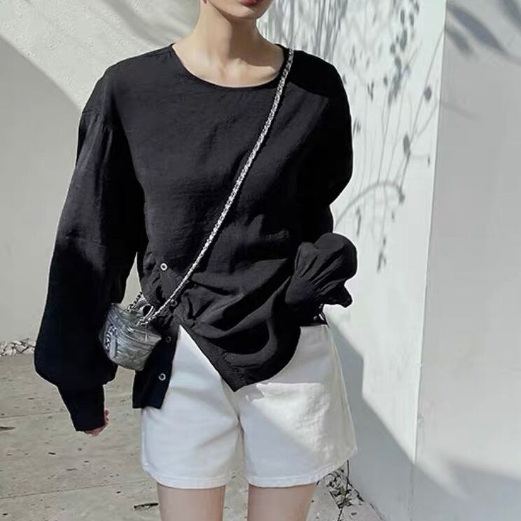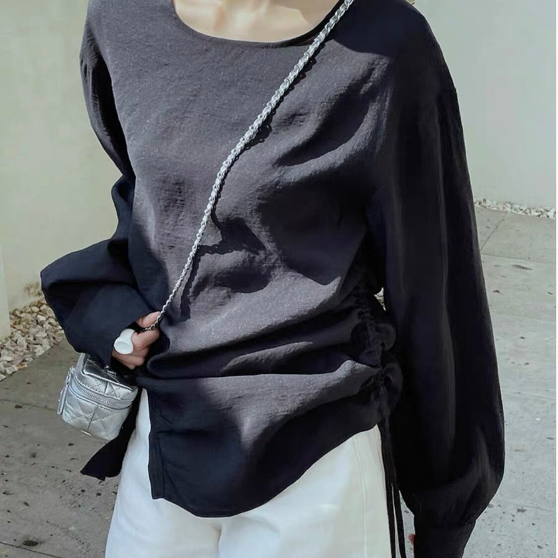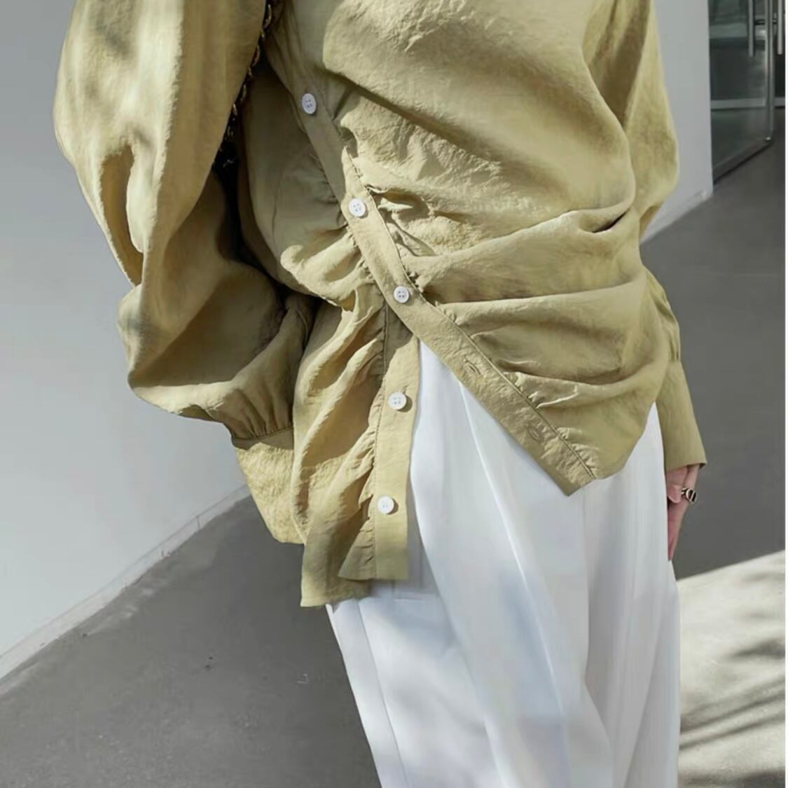 アシンメトリーなフロントデザインで遊び心のあるブラウス。