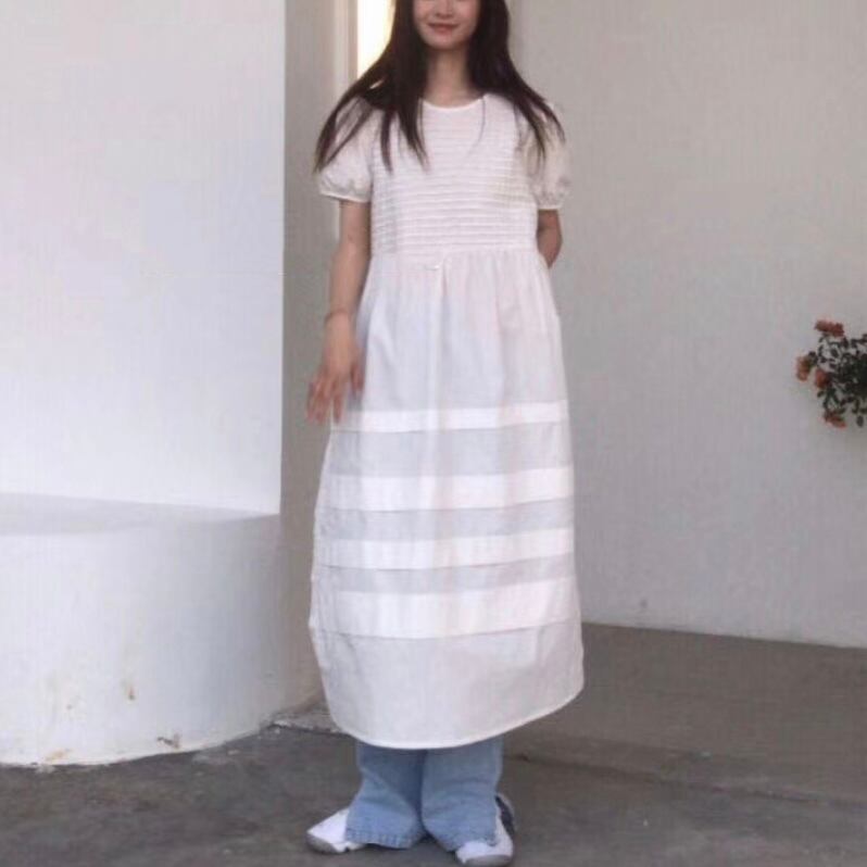 横方向にはいったボーダーラインのようなタックが目を惹くシャツワンピース。