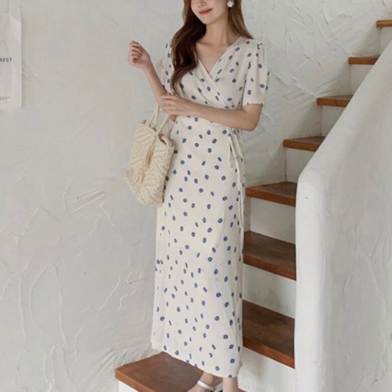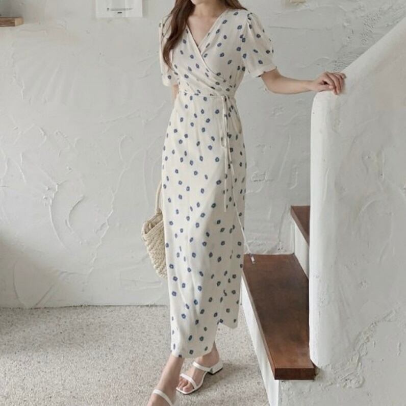 フラワープリントと女性らしいカシュクールデザインが、クラシック&フェミニンな魅力を引き立ててくれるアイテムです♪