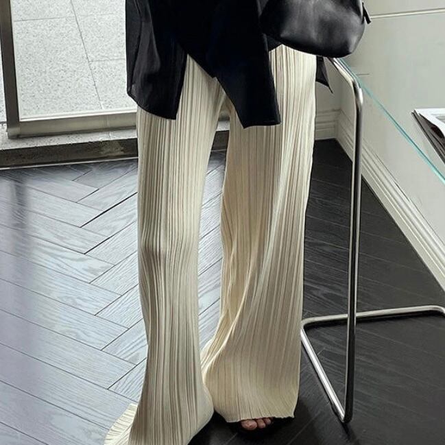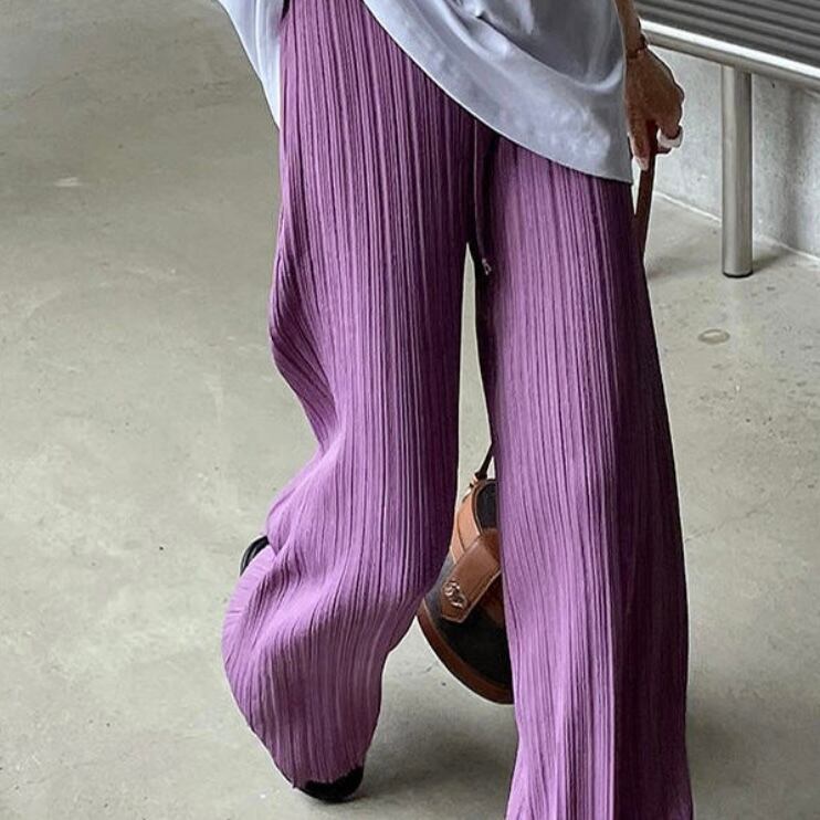 動くたびにきれいに揺れるプリーツパンツ。