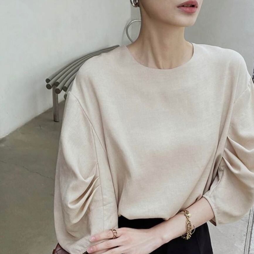 シンプルな中にもタックバルーンスリーブで、甘すぎない大人可愛いニュアンスをプラス♪