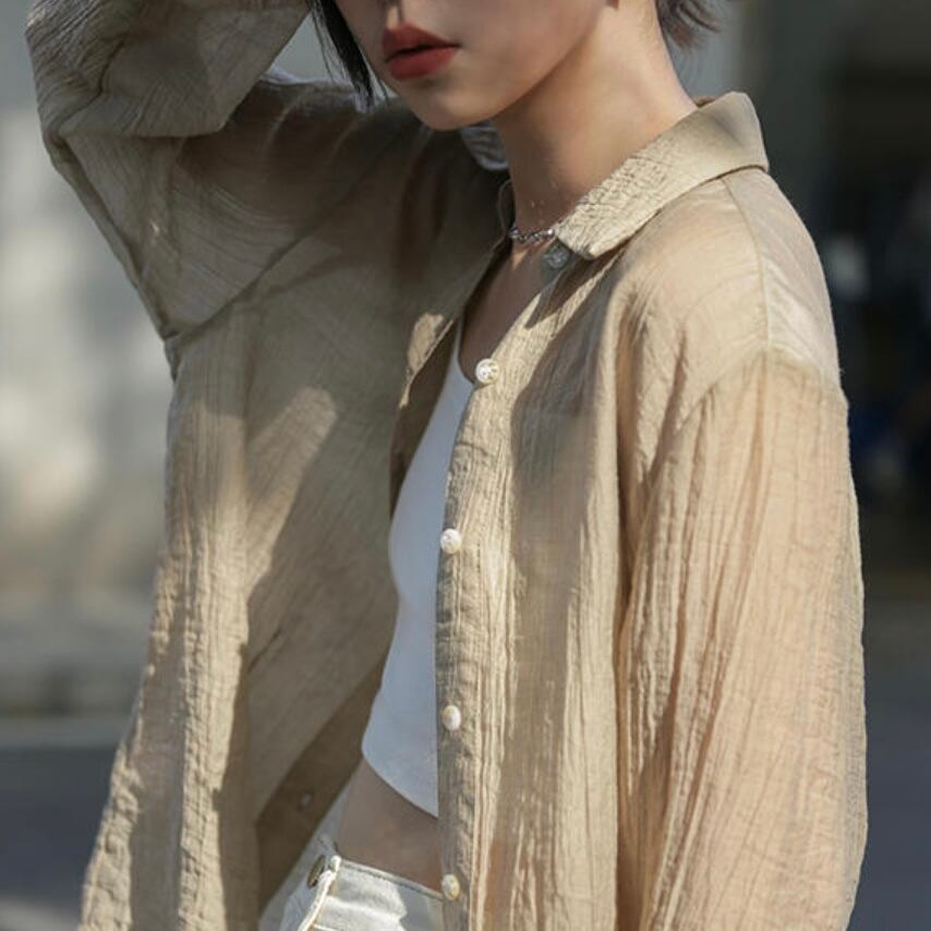 シワ加工の入ったドライタッチな素材感が目を惹くシアーシャツ♪