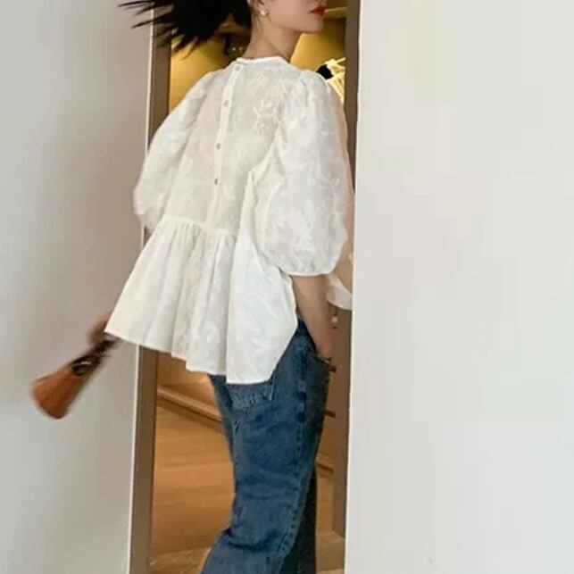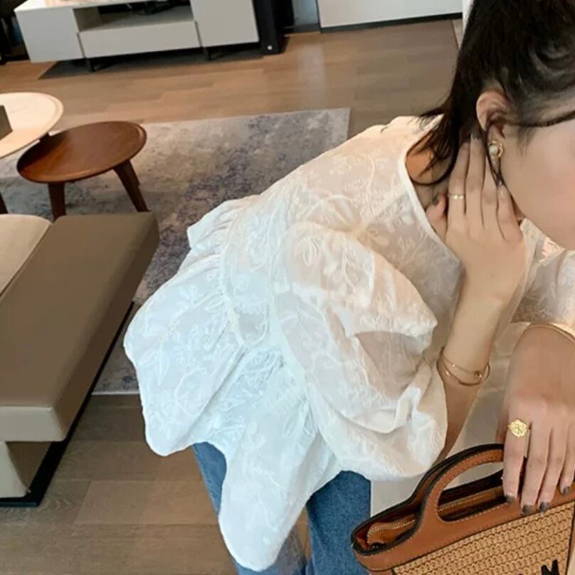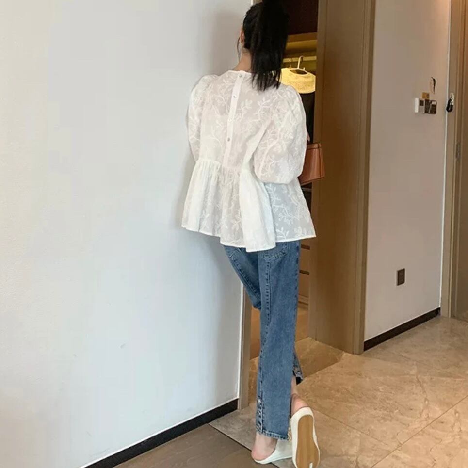 繊細なフラワー刺繍を全体に散りばめたフェミニンな印象のブラウス。