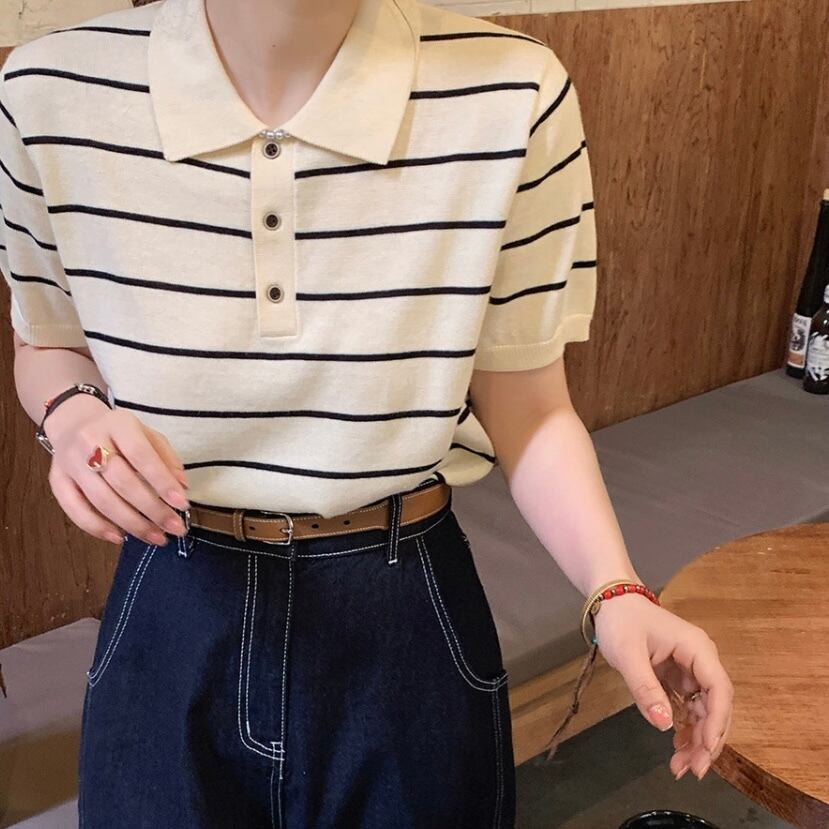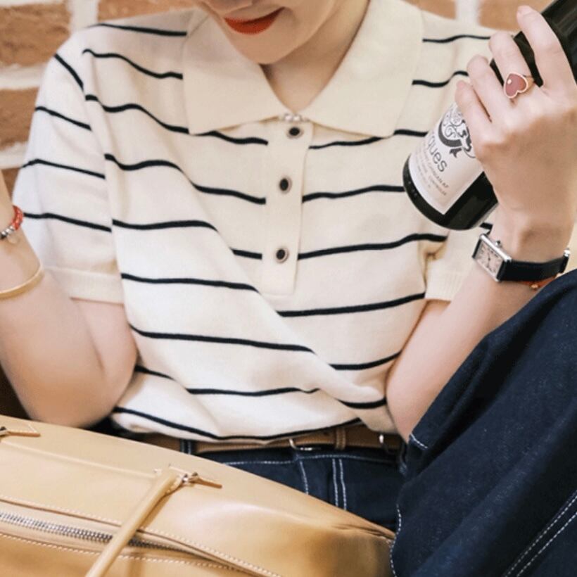 抜け感のあるポロネックがかわいい、オトナナチュラルなボーダーポロニット。