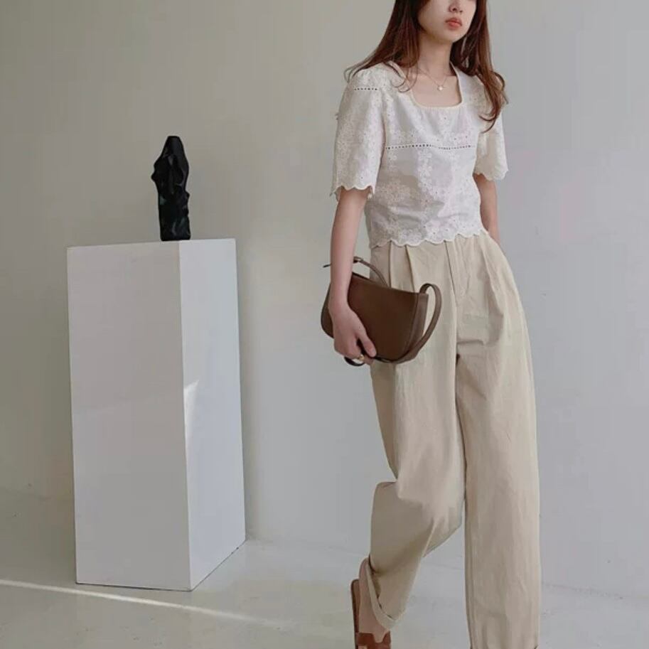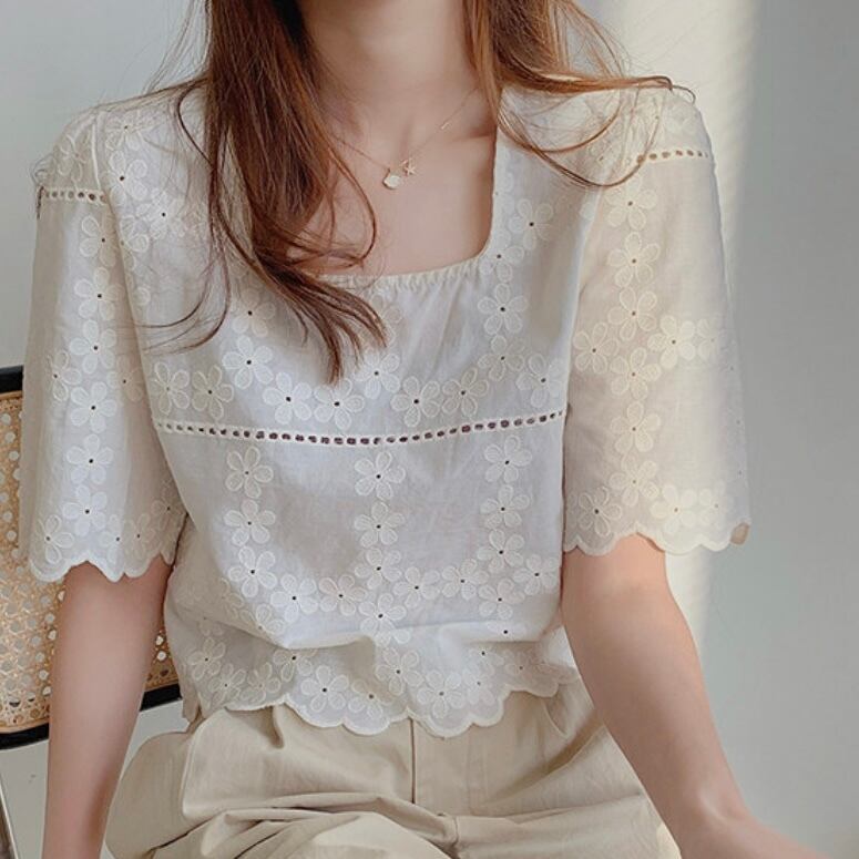 クロップド丈で花モチーフの刺繍がポイントのコットンブラウス。