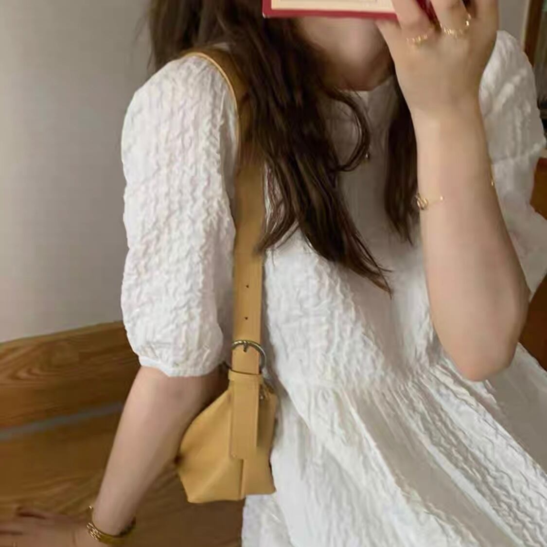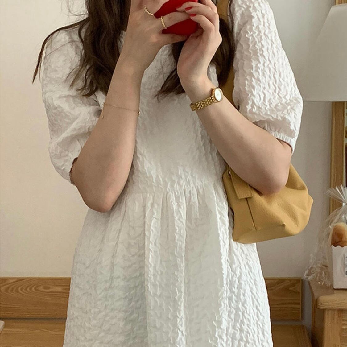 パフスリーブとAラインシルエットで、腰回りのラインを拾わずに体型カバーも◎
