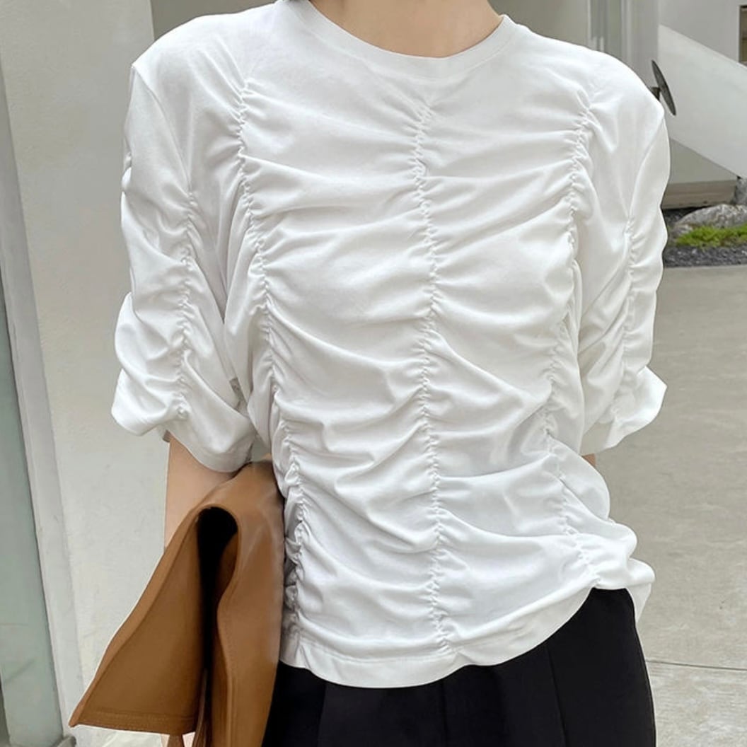 1枚で存在感の出るシャーリングデザインを施した半袖Tシャツ。