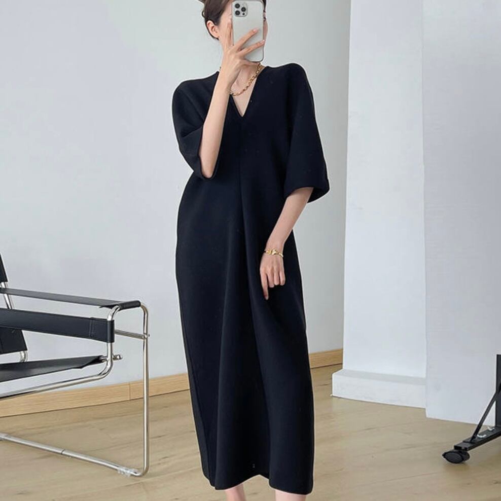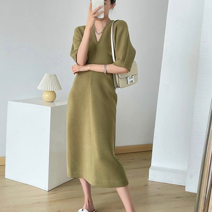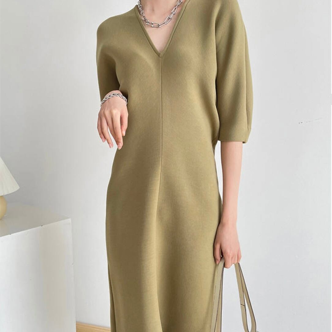上品なVネックがきれいなデコルテを演出するワンピース。