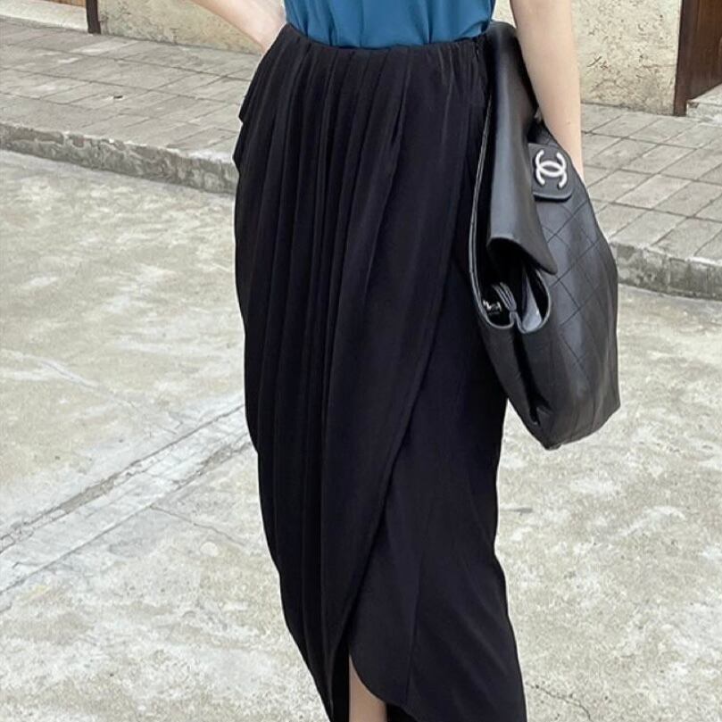 チューリップのようなラップ風デザインがフェミニンな印象のスカート。
