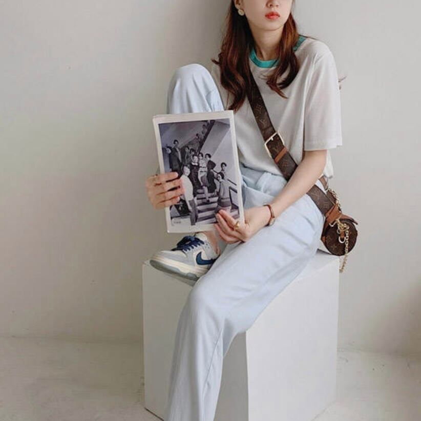 ネック部分のリブをバイカラーで仕上げたトレンドのリンガーデザインがポイント♪