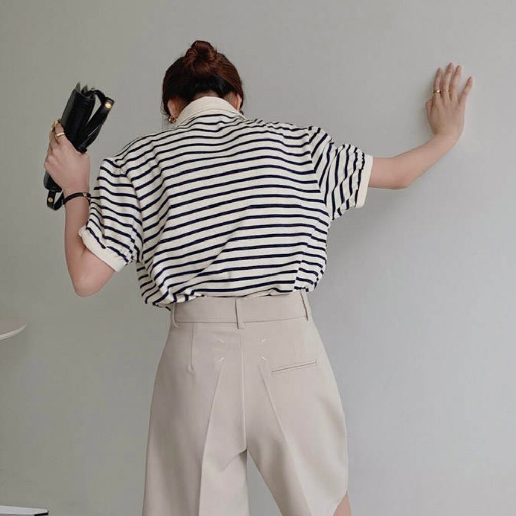 レトロさがありながら細めのボーダーが上品なトレンドのボーダートップス。