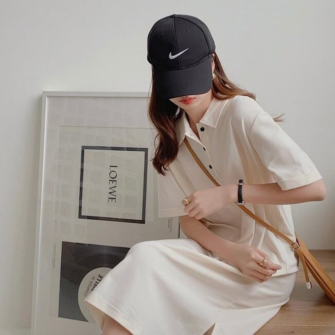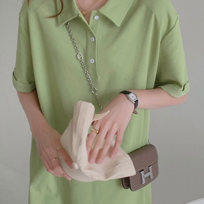 トレンドのポロシャツ襟にフェミニンさの出るシルエットがポイントのワンピース。