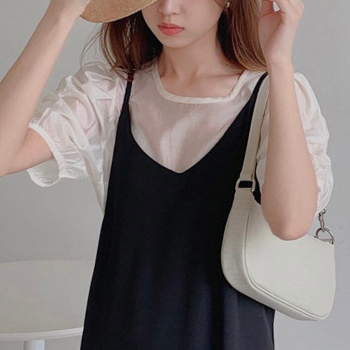 スリーブにたっぷりのギャザーをよせた絶妙な大人ガーリーなブラウスとオールシーズン着回しできる、今季トレンドのキャミワンピースのセットアイテム。