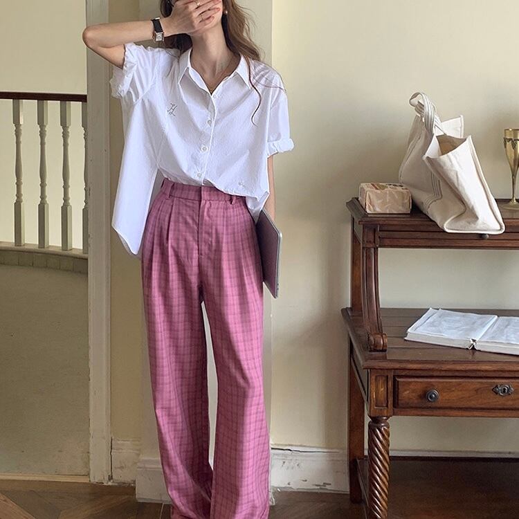 美脚効果抜群のワイドストレートシルエットのチェックパンツ。