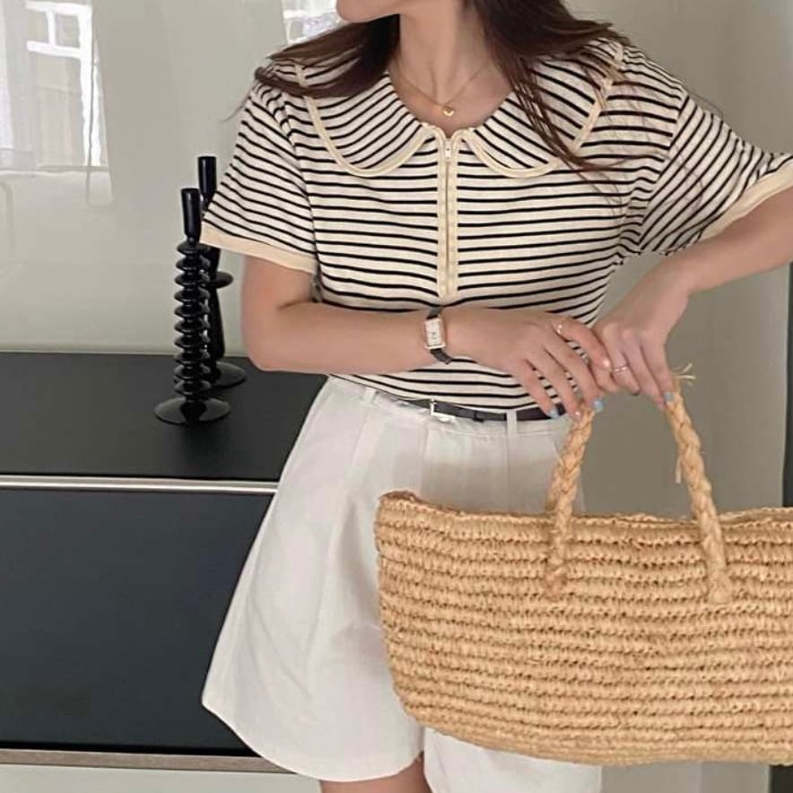 トレンド感たっぷりの襟付きボーダーカットソーと着回し力抜群のタックショートパンツのセットアイテム。