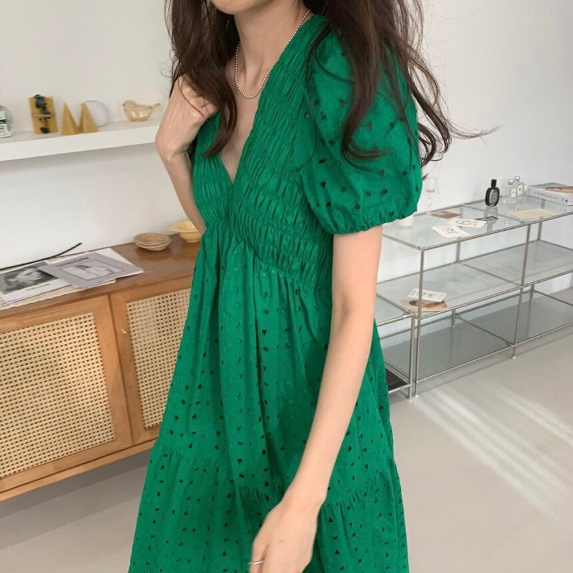 カットワークレースとシャーリングデザインが目を惹くワンピース。