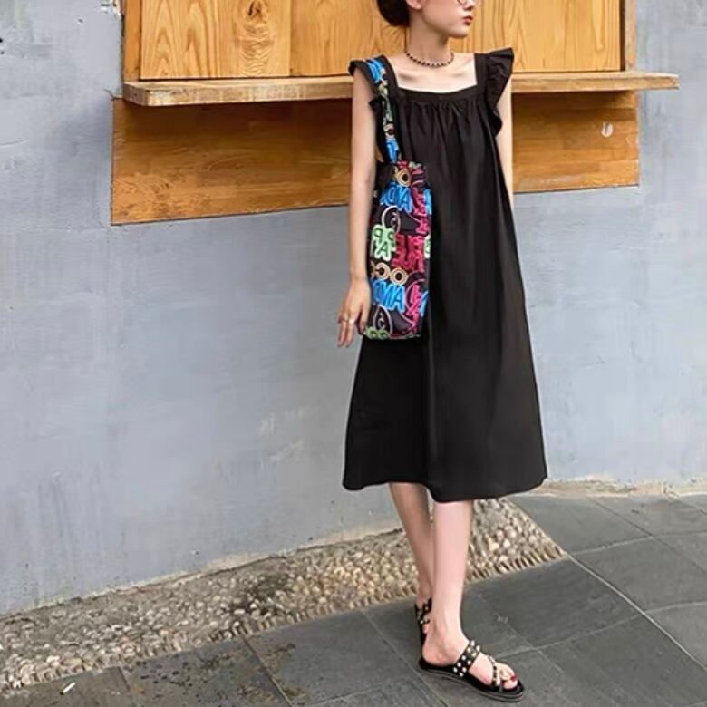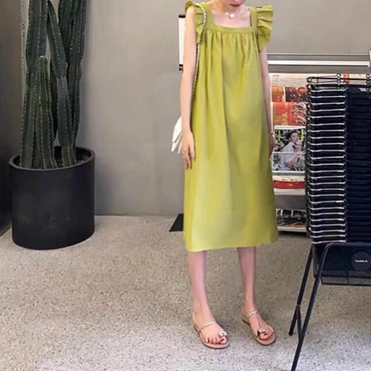 スクエアネックと肩にあしらったフリルが清楚な印象を与えるワンピース。