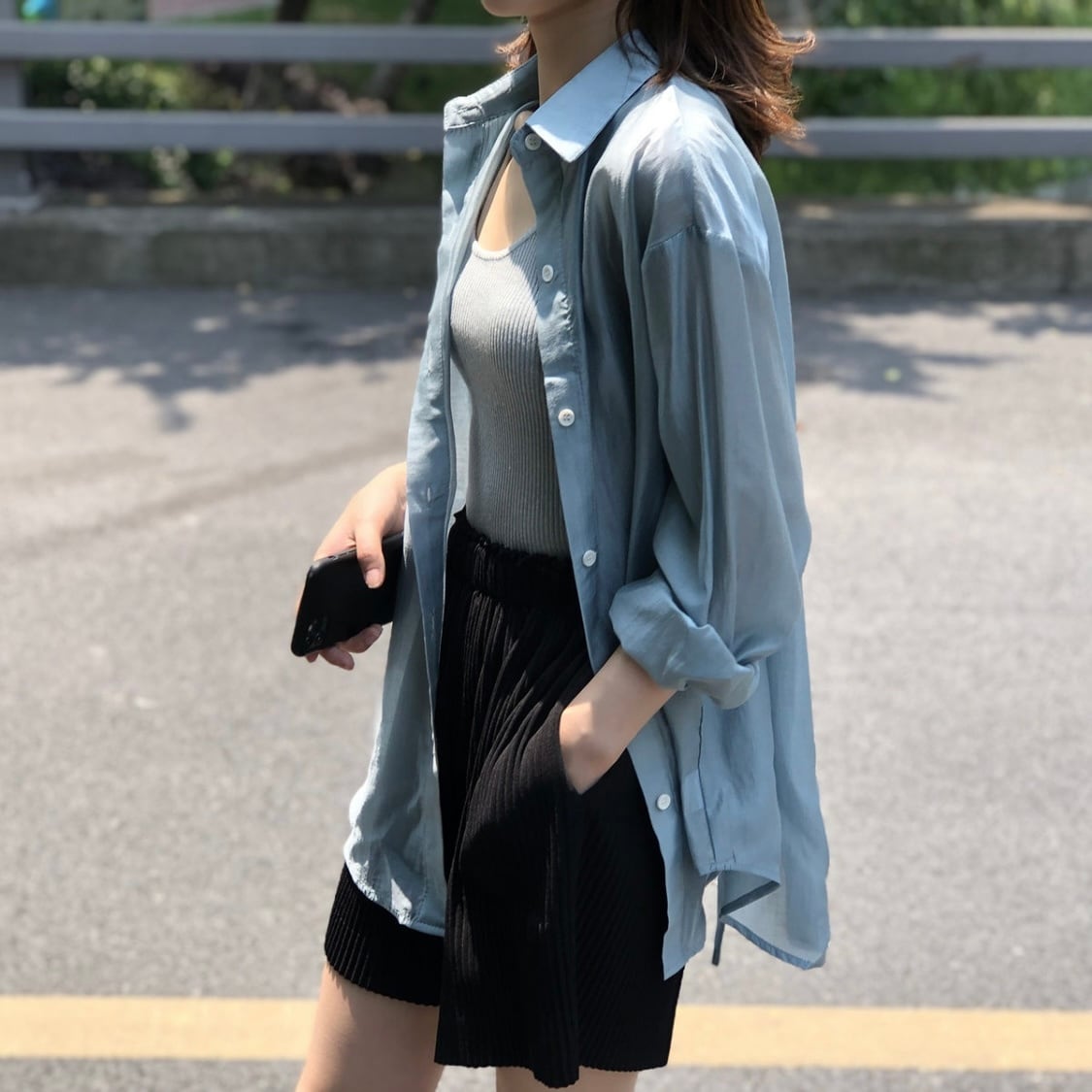 シアー素材のブラウスでふんわりと女性らしいシルエットに。