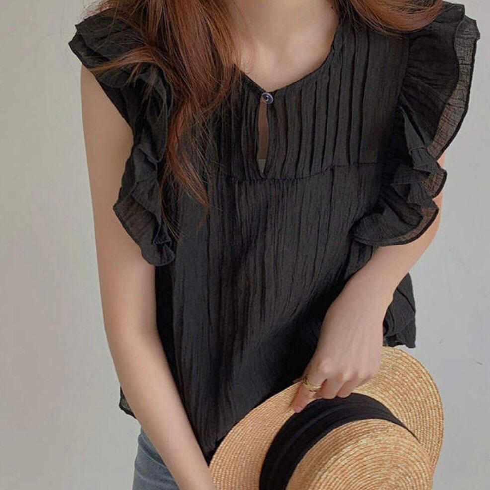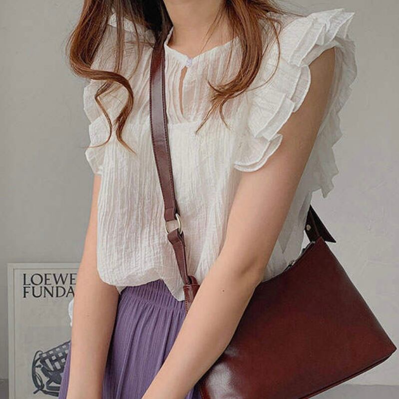 女性らしくて着映えるショルダーフリルブラウス。