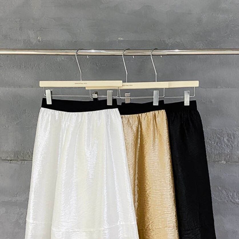 品の良い光沢感が、大人カジュアルスタイルを完成させるサテンフレアスカート。
