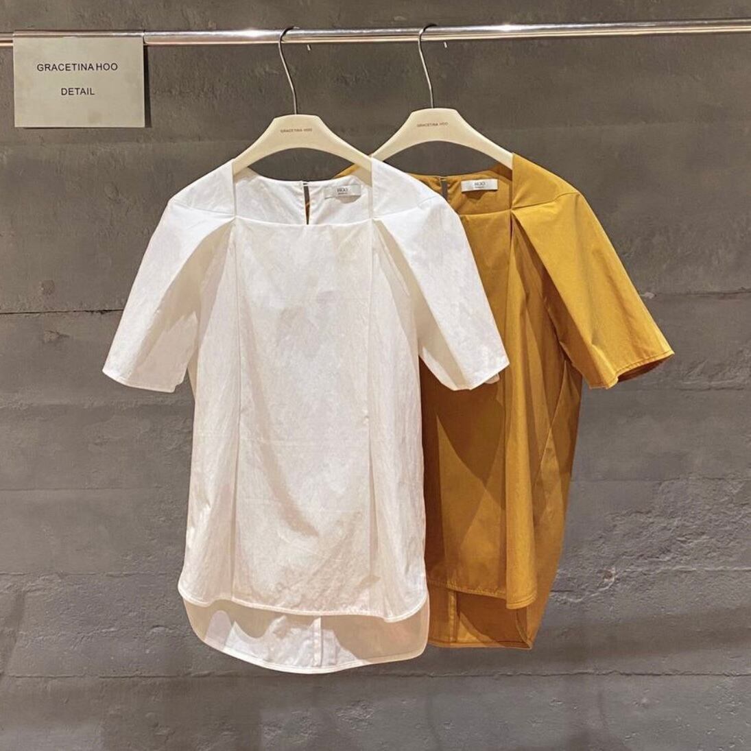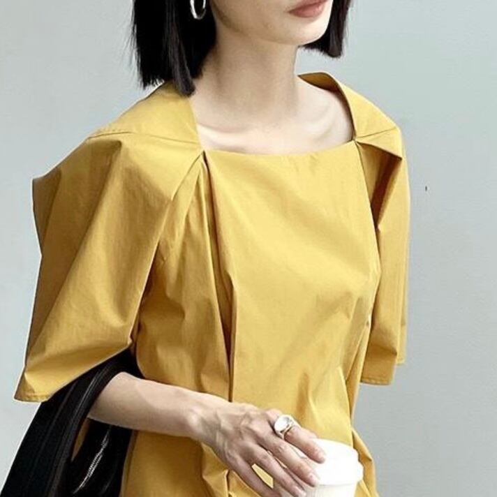 ハリのある生地を使用したタックスリーブがポイントのブラウス。