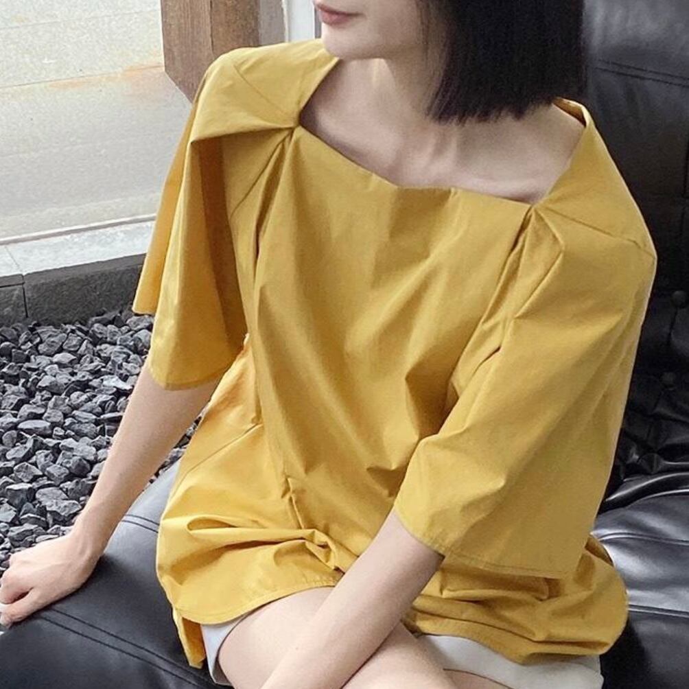 なだらかなスクエアネックで、5分丈のボリュームのある袖がポイント♪