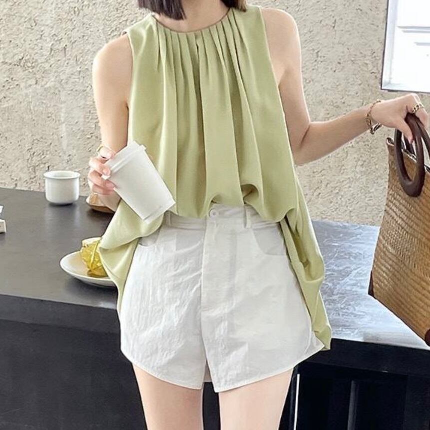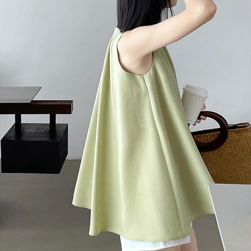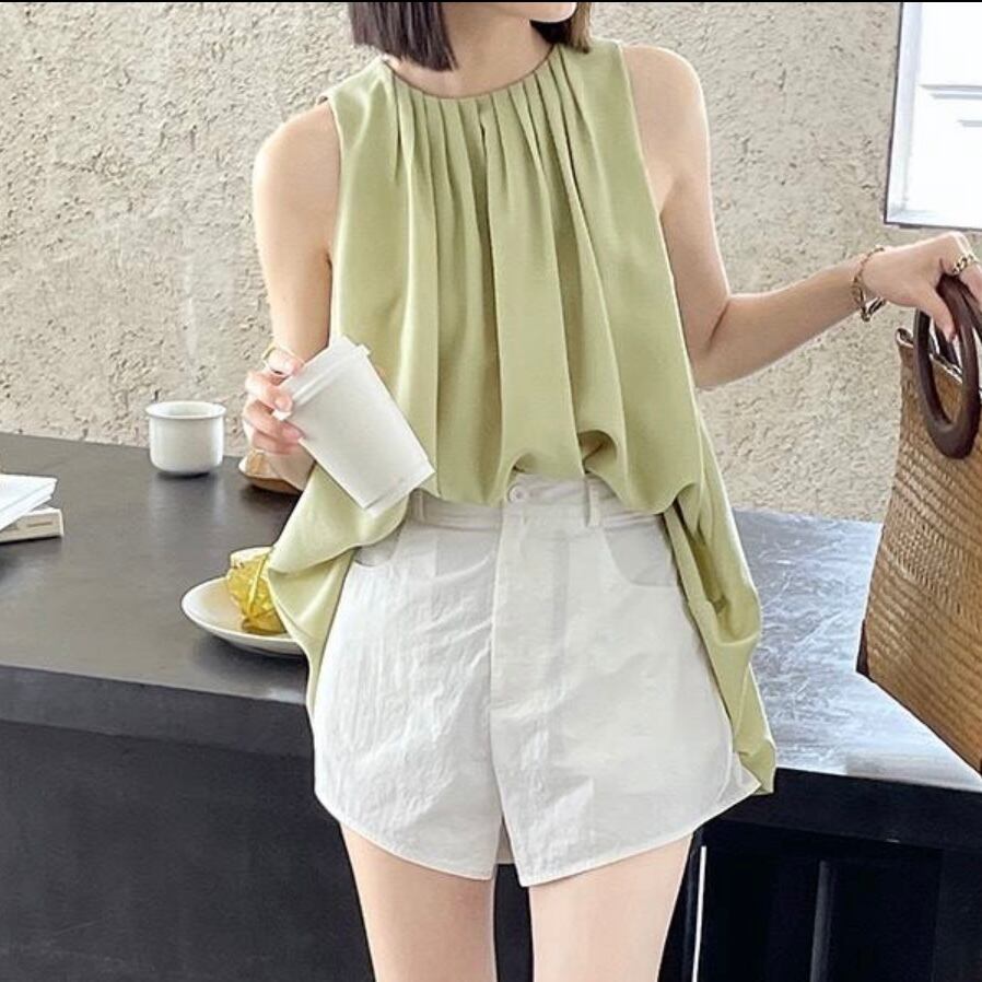 裾に向かって広がるフレアシルエットでフェミニンかつエアリーな印象ながらアメリカンスリーブのデザインにすることで甘くなり過ぎずヘルシーなバランスに♪