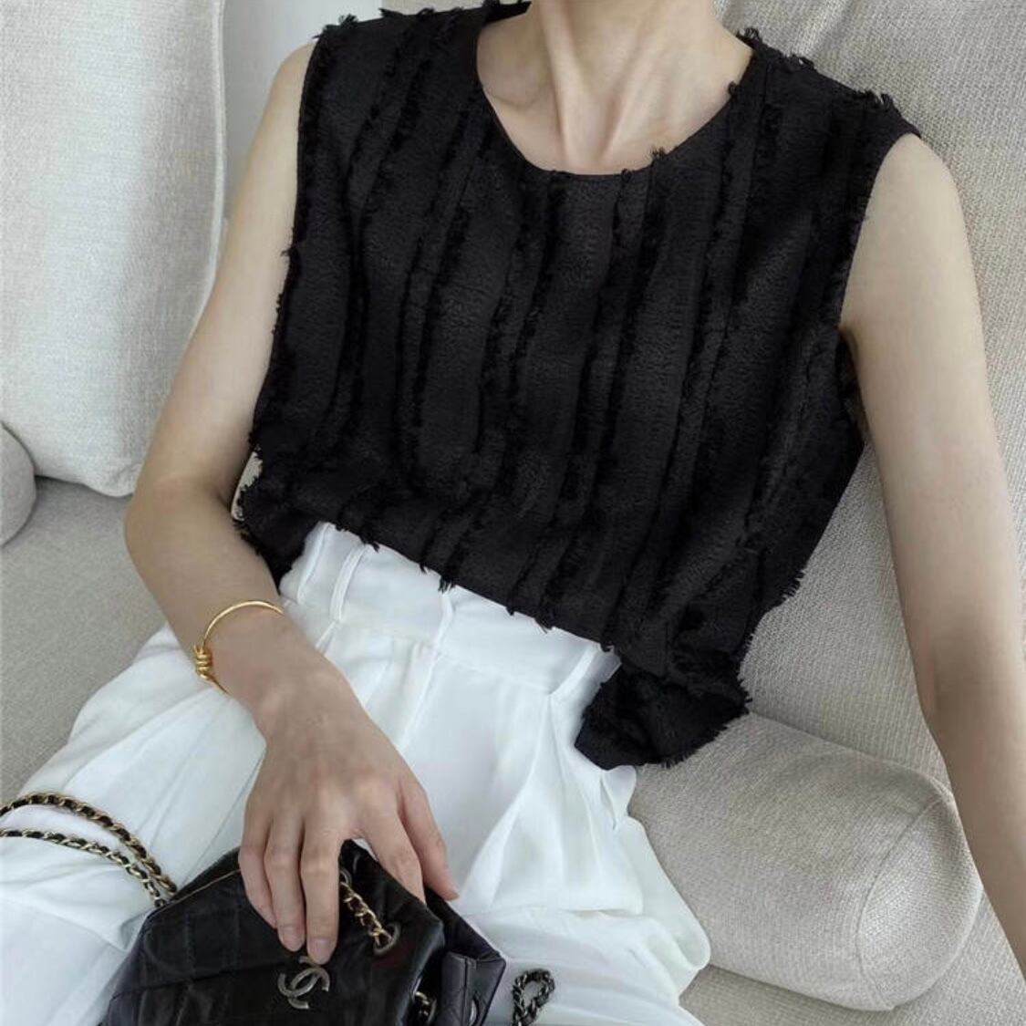 フリンジと生地の凹凸で表現したランダムストライプで縦ラインを強調しスッキリした印象に♪